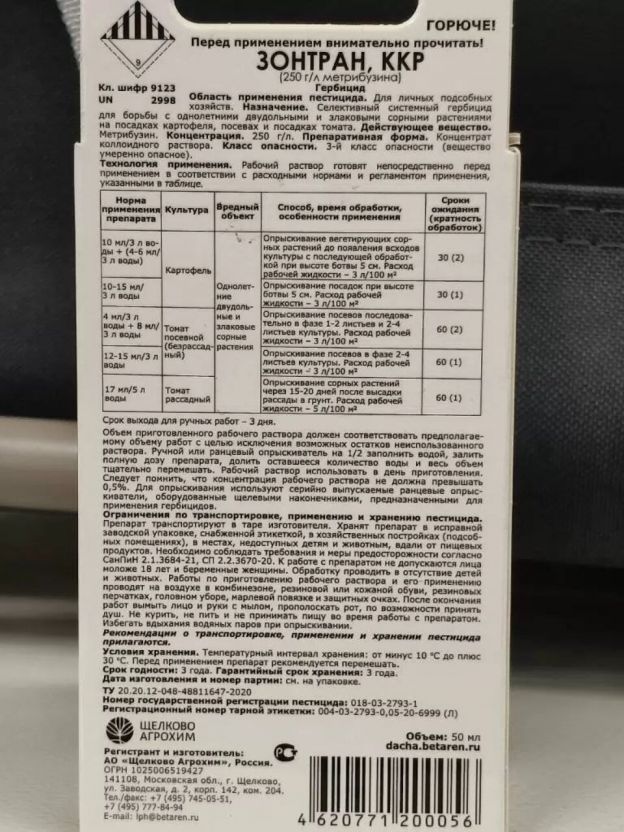 Ищете эффективное средство для борьбы с сорняками на картофеле и томатах? Гербицид Зонтран от Щелково Агрохим — идеальный выбор! Это средство от сорняков, которое убивает растения вместе с корнями и обеспечивает длительный эффект до 30 дней, не смываясь дождем.