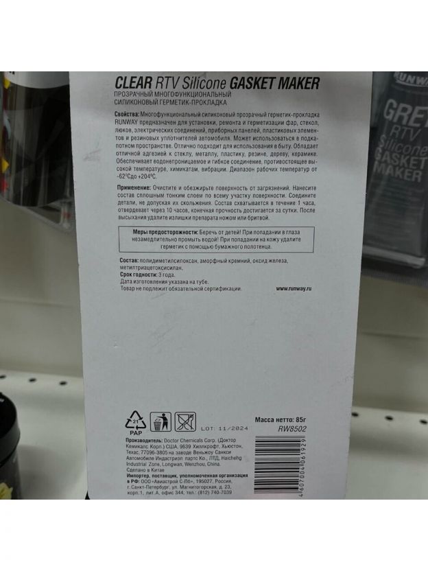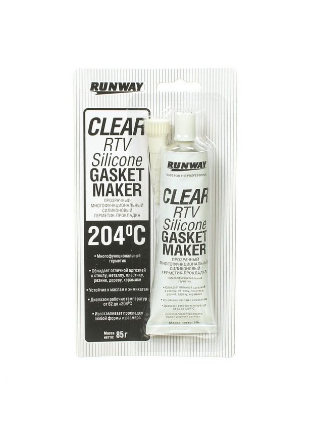 Многофункциональный силиконовый прозрачный герметик-прокладка "Runway" предназначен для установки, ремонта и герметизации фар, стекол, люков, электрических соединений, приборных панелей, пластиковых элементов и резиновых уплотнителей автомобиля. Может использоваться в подкапотном пространстве. Отлично подходит для использования в быту. Обладает отличной адгезией к стеклу, металлу, пластику, резине, дереву, керамике. Обеспечивает водонепроницаемое и гибкое соединение, противостоящее высокой температуре, химикатам, вибрации. Диапазон рабочих температур от -62 до +204°С.