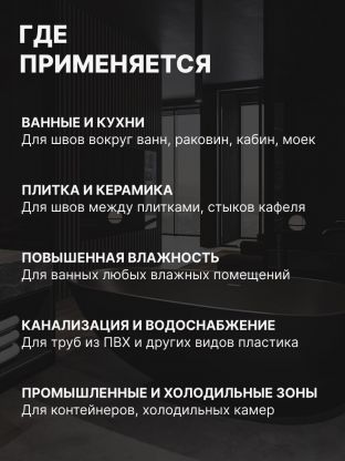 - Герметизация в системах канализации и водоснабжения, труб и соединений из ПВХ, заделка швов между плитками