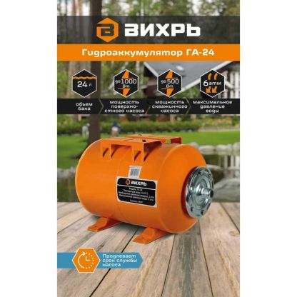 Гидроаккумулятор Вихрь ГА-24 используется для аккумулирования воды под давлением и сглаживания гидроударов. Он состоит из стального резервуара со сменной мембраной из пищевой резины и имеет пневмоклапан для закачивания сжатого воздуха. Гидроаккумулятор подбирается в зависимости от мощности и производительности насоса, используется в системе водоснабжения совместно со скважинным или поверхностным насосом.