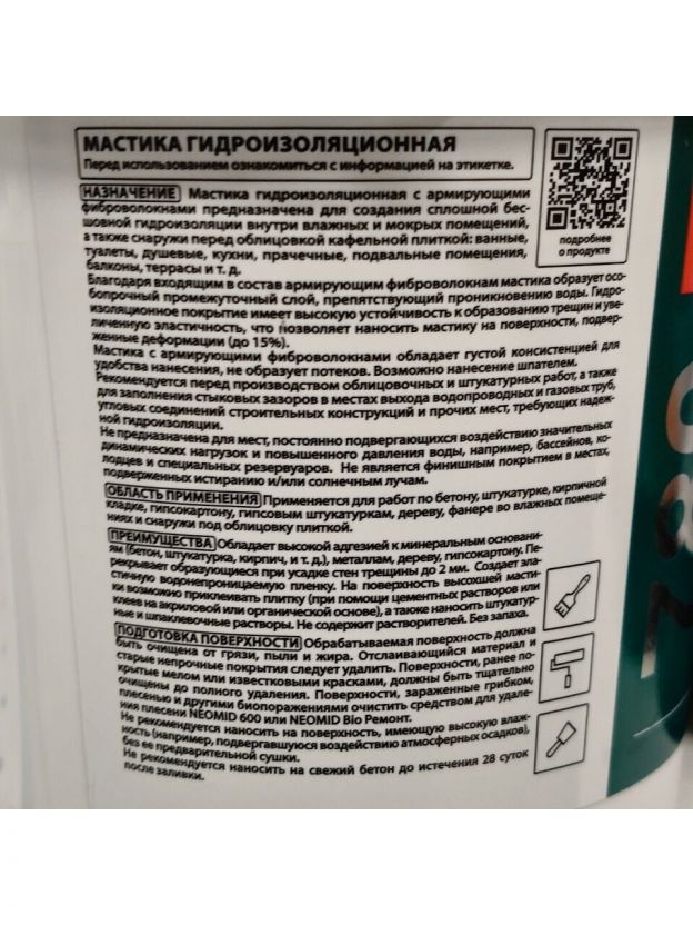 Мастика гидроизоляционная с армирующими фиброволокнами предназначена для создания сплошной бесшовной гидроизоляции внутри влажных и мокрых помещений, а также снаружи перед облицовкой кафельной плиткой: ванные, туалеты, душевые, кухни, прачечные, подвальные помещения, балконы, террасы и т.д.