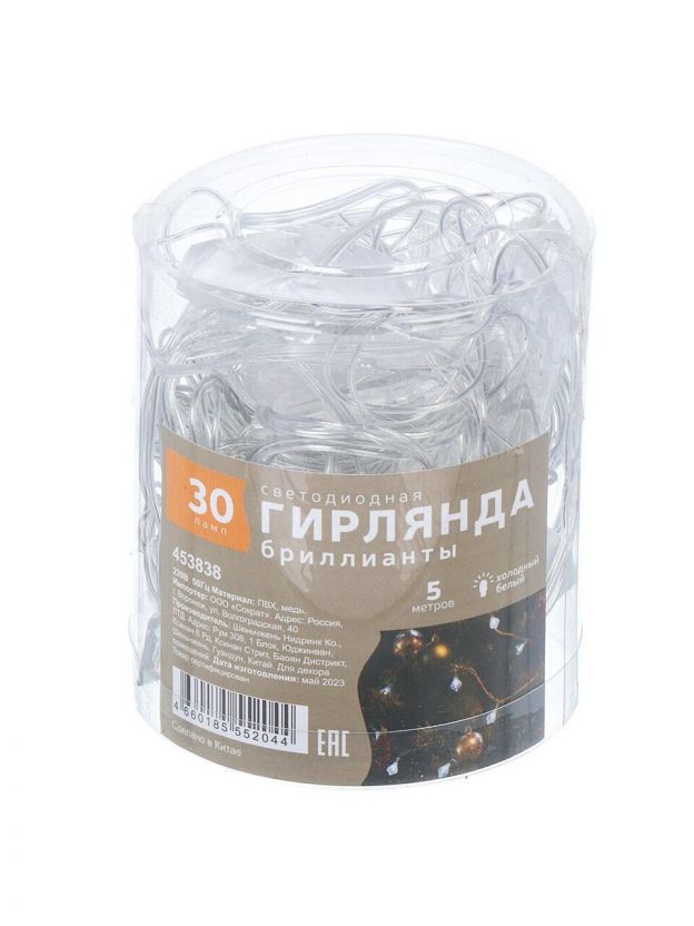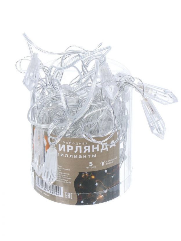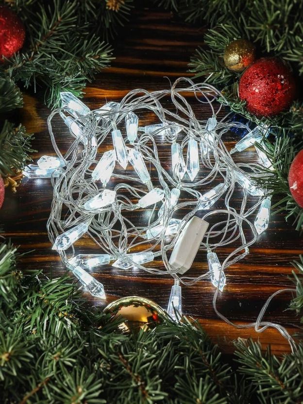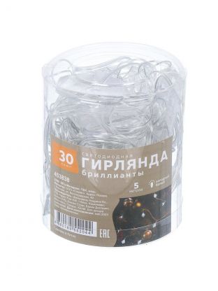Гирлянда 30 ламп, 5 м, 1 режим, Бриллианты, холодный белый свет, прозрачная, в помещении, сетевая, LED, Y4-7534