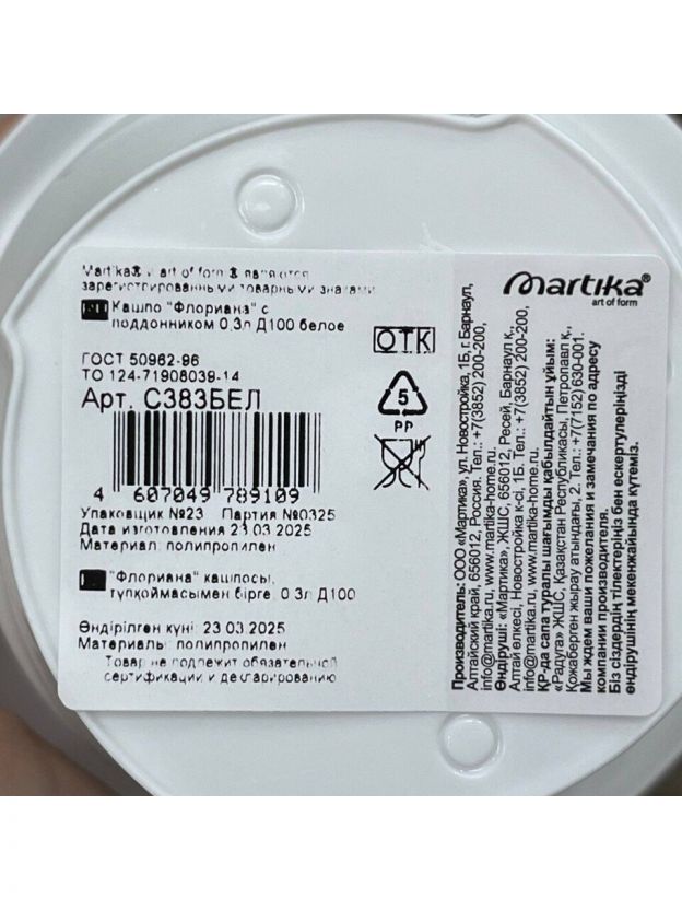 Горшок для цветов пластик, 0.3 л, 10х7.6 см, белый, Martika, Флориана, С383БЕЛ