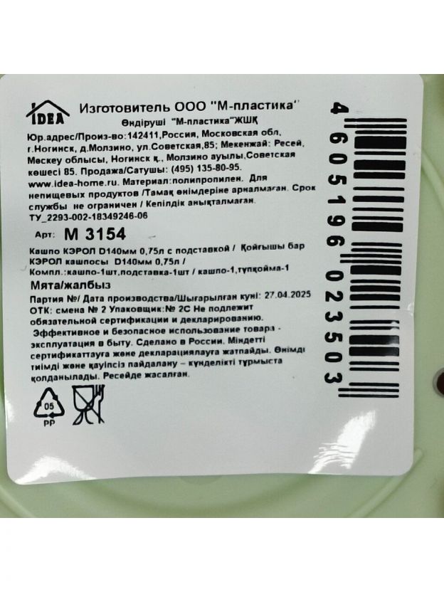 Горшок для цветов пластик, 0.75 л, 14х10 см, мятный, Idea, Кэрол, М 3154