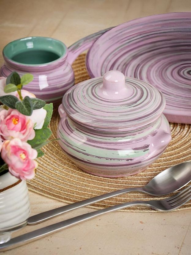 Посуда изготовлена из экологически чистой красной глины, покрытие - из пищевой глазури. Можно использовать во всех типах печей, включая микроволновые, нельзя только ставить на открытый огонь. Все горшки для запекания – с ручками, не нужен ухват для выемки горячего изделия из духовки, все изделия накрыты еврокрышкой особой формы, препятствующей разбрызгиванию продукта и попаданию под крышку внутрь посторонних продуктов.