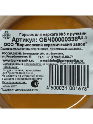 Горшок для запекания керамика, 0.5 л, с ручками, Борисовская керамика, №5, ОБЧ00000338