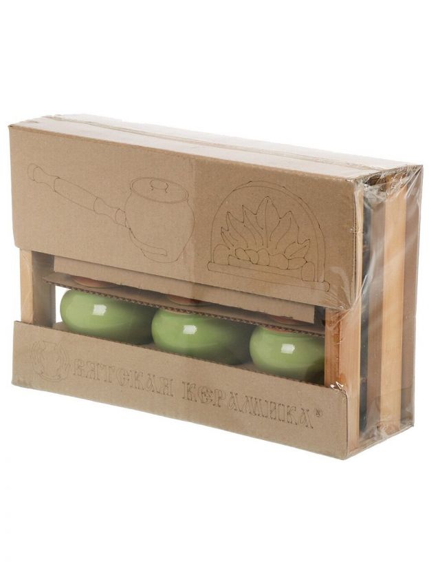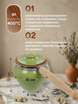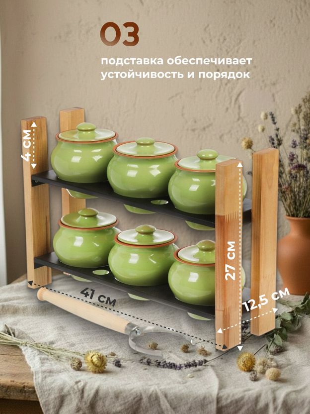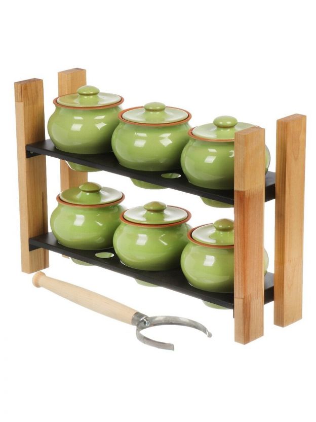 - В комплекте с горшками поставляется удобная подставка, которая обеспечивает устойчивость и порядок на вашей кухне, а также специальный ухват, позволяющий безопасно доставать горячие горшки из духовки или печи.