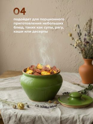 - Объем каждого горшка идеально подойдет для порционного приготовления небольших блюд, таких как супы, рагу, каши или десерты.