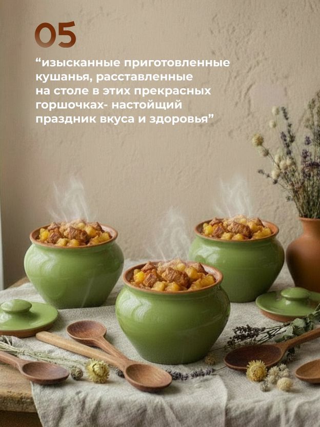 Приобретая комплект керамических горшочков для запекания вы получаете больше, чем просто качественную и надежную посуду. Этот набор открывает новые горизонты для кулинарного творчества, позволяя исследовать разнообразные рецепты и создавать вкуснейшие и полезные блюда для себя и своей семьи. Как изысканно будут выглядеть приготовленные кушанья, расставленные на столе в этих прекрасных горшочках! С таким набором каждый ужин превратится в настоящий праздник вкуса и здоровья.