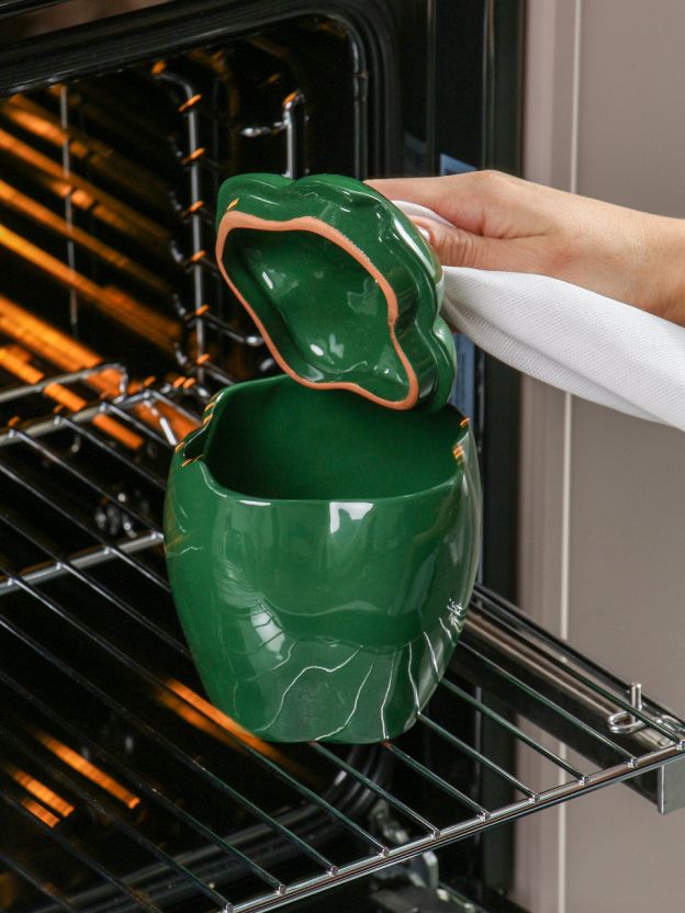 Если сравнивать с металлическими и стеклянными аналогами, керамика лучше держит температуру и не влияет на вкус продуктов. Горшок легко мыть, он не впитывает запахи, а крышка помогает сохранить сочность блюда. Подходит ли для дачи? — Да, изделие удобно брать с собой, оно устойчиво к перепадам температур и долговечно при аккуратном использовании.
