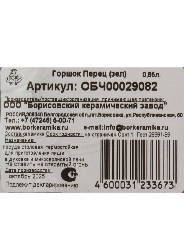 Горшок для жаркого Борисовская керамика Перец 0.65 л — стильное решение для домашней кухни и дачи: натуральная керамика, продуманный объём, выгодное предложение.