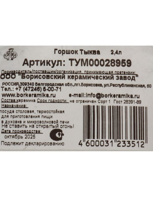 Горшок для жаркого 2.4 л Борисовская керамика Тыква: готовьте вкуснее, сохраняйте тепло и аромат блюд дольше — для семьи, дачи или подарка.