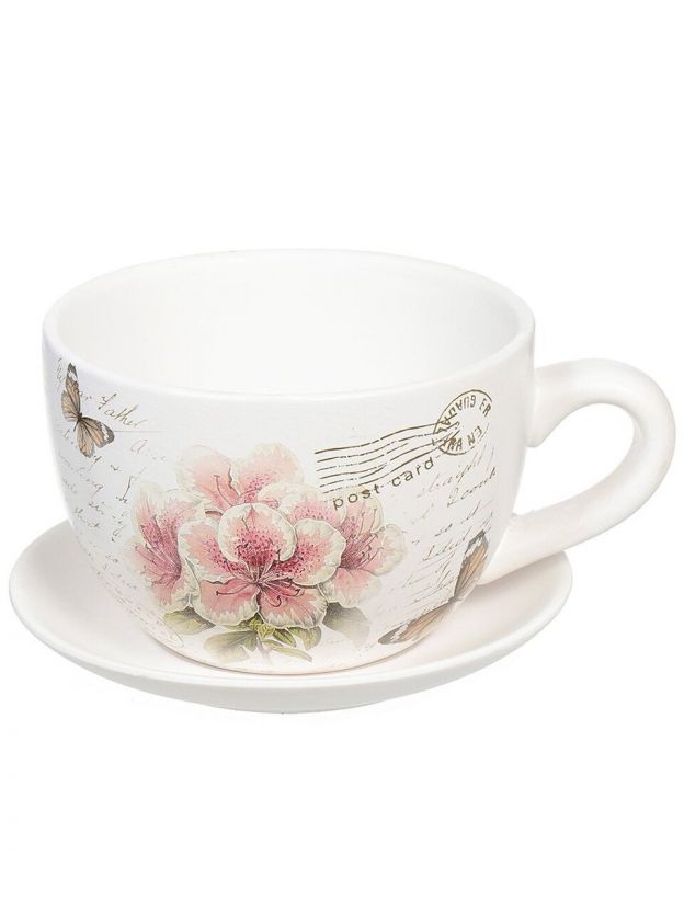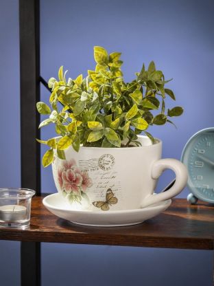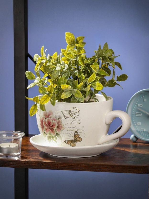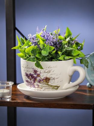 Креативный горшок из керамики выполнен в виде чашки с блюдцем. Оригинальная форма и высокая функциональность рождают интересное сочетание, которое понравится поклонникам нестандартных решений и практичности одновременно. А вместительный поддон поможет не беспокоиться о вылившейся на подоконник грязной воде.