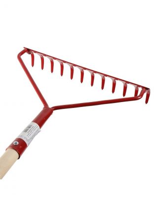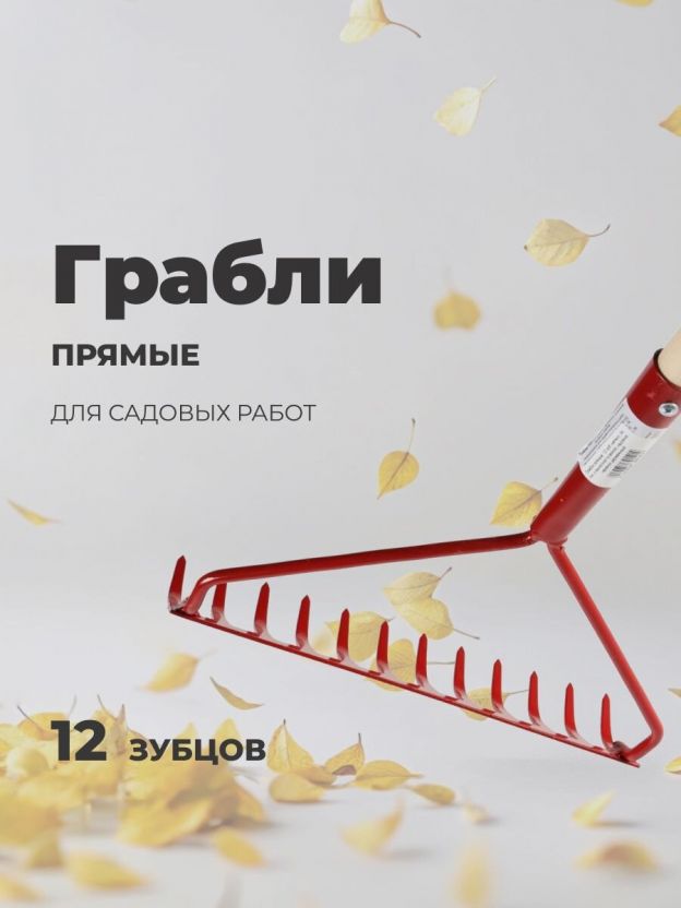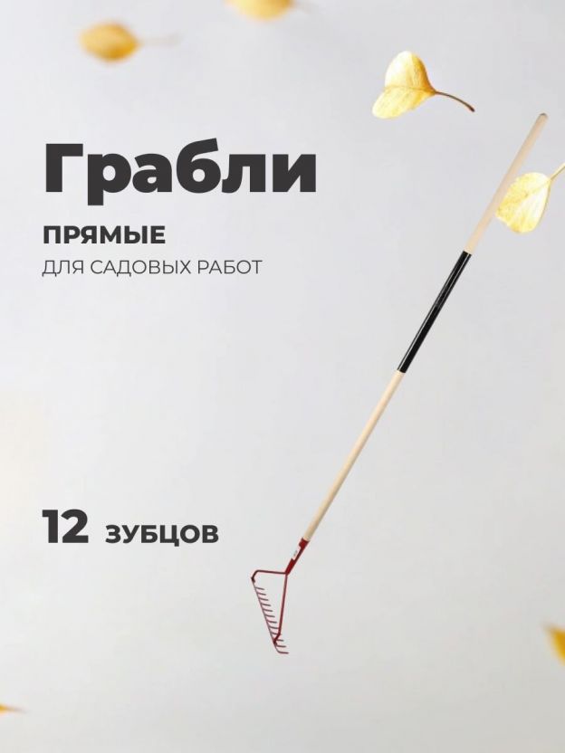 Грабли прямые, 12 зуб, металл, 34 см, с выносной тулейкой, садовые, черенок деревянный