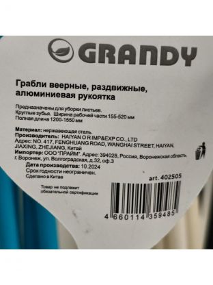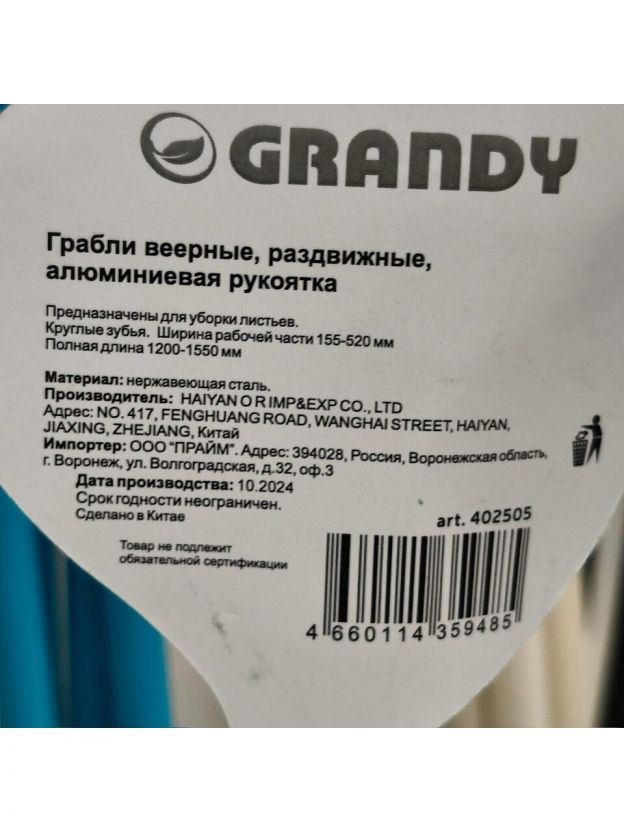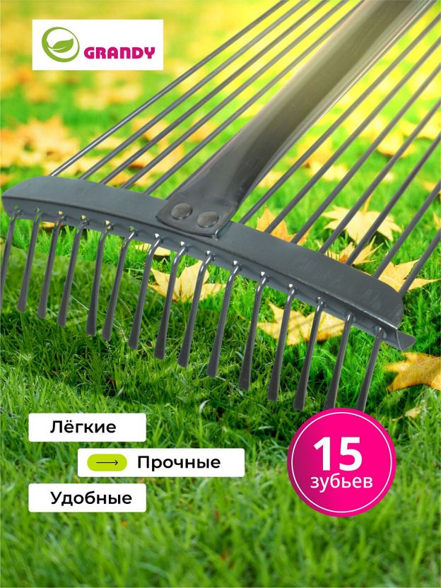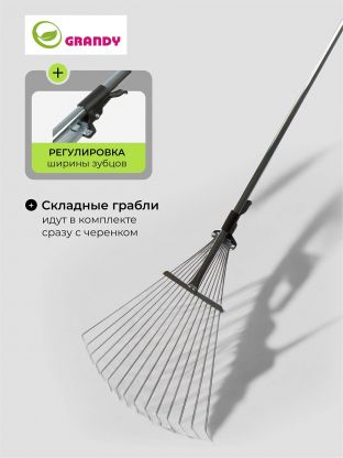 Грабли веерные, 15 зуб, металл, Grandy, Grandy, 15.5-52х120-155 см, раздвижной, черенок металлический, 402505