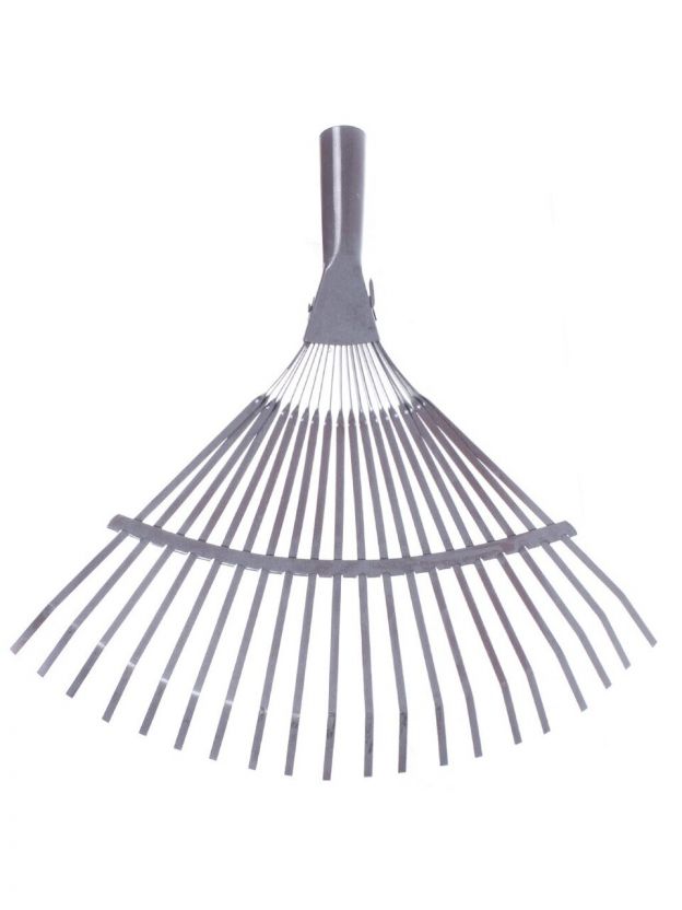 Грабли веерные металлические имеют 18 плоских зуба. Изделие окрашено, что обеспечивает надежную защиту от коррозии. Расположенная сверху распорка усиливает пружинящий эффект и дополнительно упрочняет конструкцию. Диаметр отверстия под черенок - 25 мм.