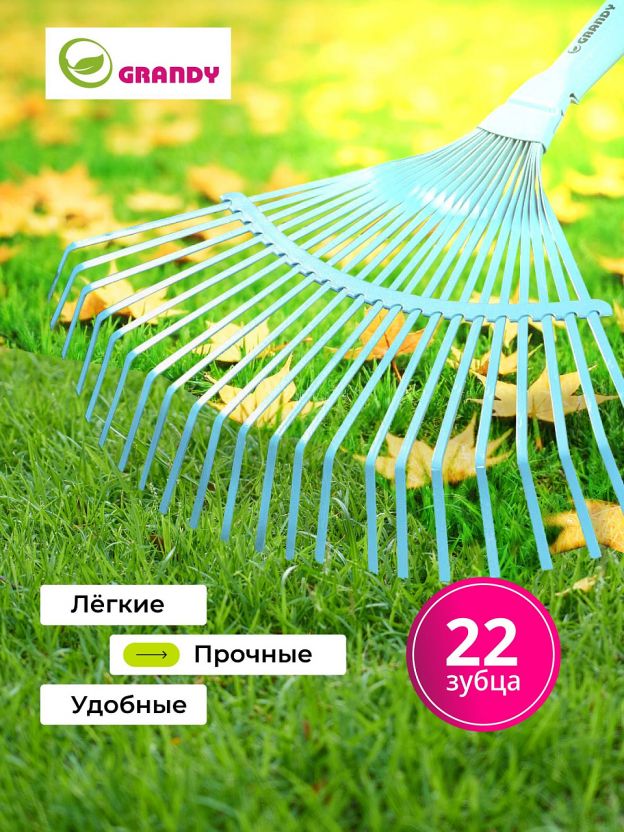Повысьте эффективность ухода за участком — закажите грабли Grandy 22 зуба по выгодной цене и убедитесь в их надежности. Быстрая доставка, гарантия качества и возможность подобрать черенок под свои задачи!