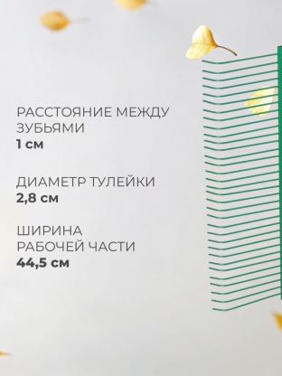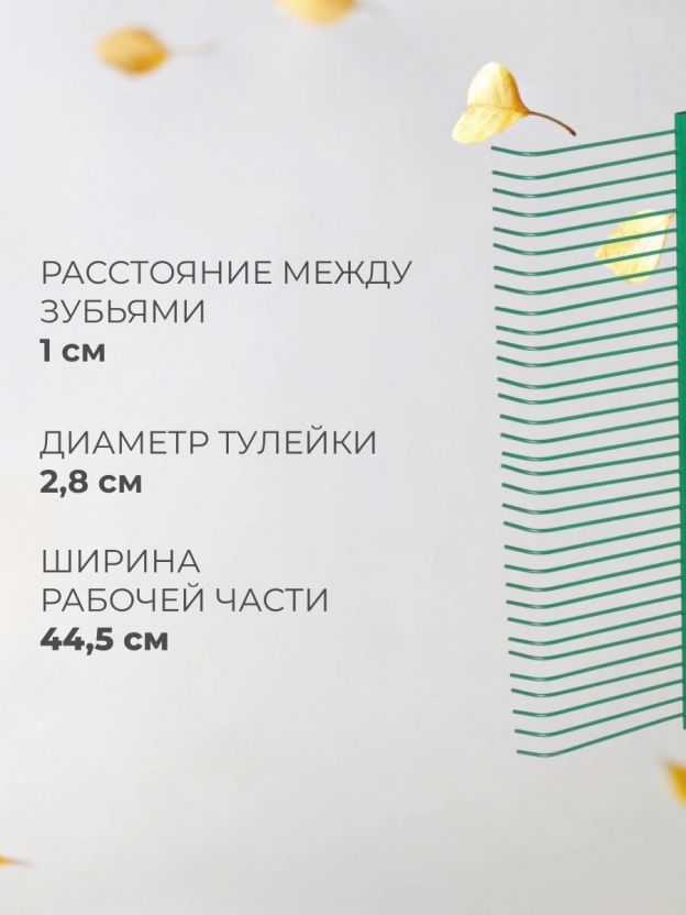 Рабочая ширина составляет 44,5 см, количество зубцов — 33. Такой размер удобен для уборки как небольших, так и просторных участков, экономит время и силы.
