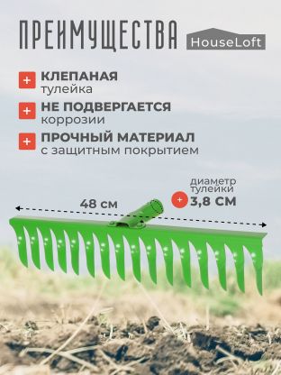 Грабли витые, 16 зуб, сталь, 48 см, HouseLoft, без черенка, садовые, 00-00002615