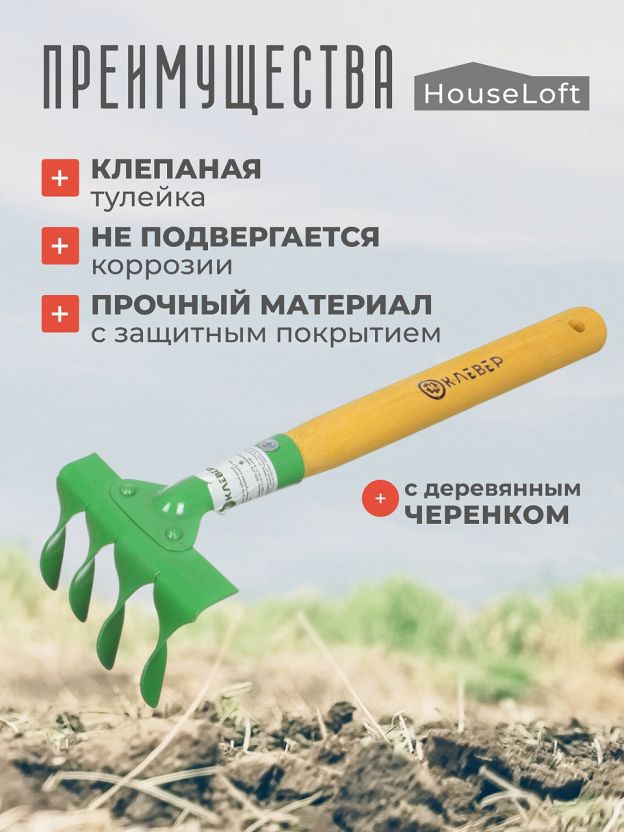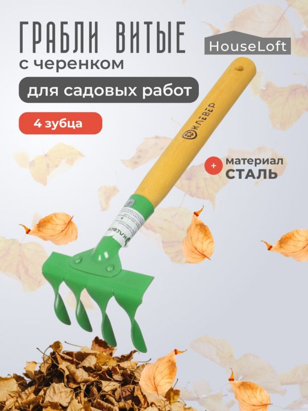 Грабли витые, 4 зуб, сталь, HouseLoft, клепанная тулейка, садовые, черенок деревянный, ГВ4 00-00002611