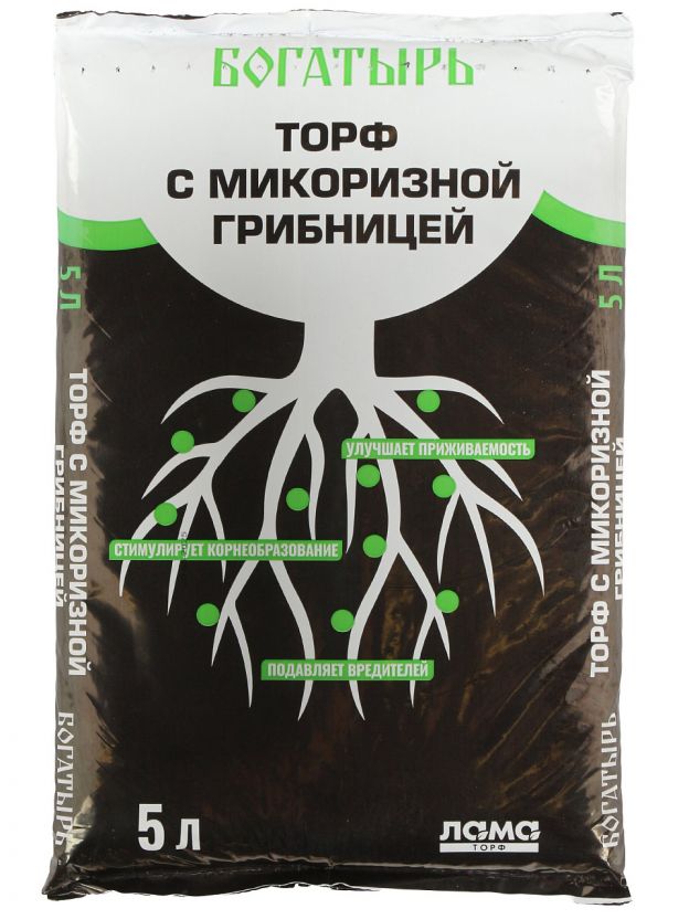 Грунт торфяной Богатырь с микоризной грибницей 5 л — быстрый рост растений и здоровые корни для вашего сада или рассады по выгодной цене.