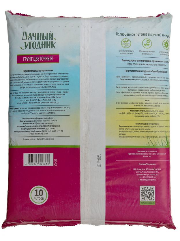 • Удобный объём 10 литров — подходит для пересадки, обогащения почвы в горшках и клумбах, длительный срок хранения.