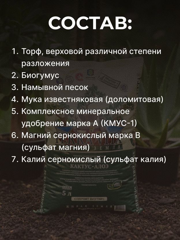 Откройте для себя идеальный грунт для ваших растений! Грунт "Денежное дерево-Кактус-Алоэ" от бренда Terra Vita создан для истинных любителей зелени. Его уникальный состав из торфа и биогумуса обеспечит вашим растениям здоровый рост и обильное цветение круглый год. Универсальный объем 5 литров подходит для посадки и обогащения почвы, повышая урожайность.