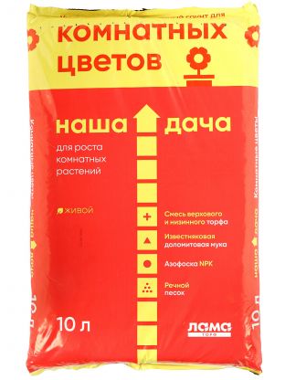 Объём — 10 литров, состав — торф, речной песок, органические добавки. Подходит для горшечных и балконных растений, легко пересыпается, не содержит токсичных компонентов.