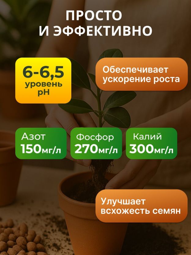 Содержание основных питательных элементов, мг/л, не менее: Азот (NH4+NO3) - 150, Фосфор (P2O5) - 270, Калий (K20) - 300 pH солевой суспензии - 6,0-6,5