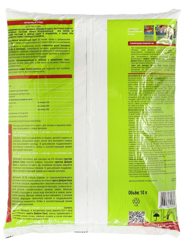 Грунт для рассады «Добрая сила», 10 л — универсальное решение для здорового роста овощей, цветов и ягод, с торфяной основой для максимального урожая.