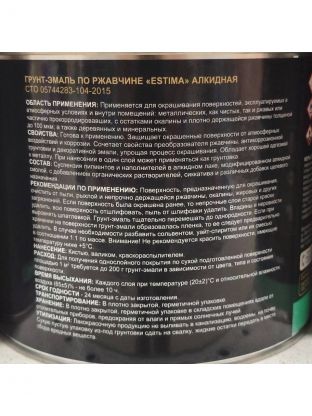 С грунт-эмалью Estima вы получаете качественный продукт, который сэкономит ваше время и средства на ремонт и обслуживание металлических поверхностей. Это оптимальное решение для тех, кто хочет сохранить металлические конструкции в идеальном состоянии на долгие годы.