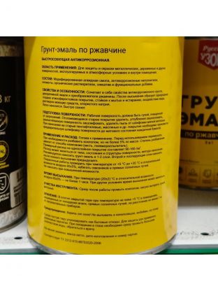 Свойства и особенности: сочетает в себе свойства антикоррозионного грунта, декоративной эмали и преобразователи ржавчины. После высыхания образует однородное, гладкое, атмосферостойкое покрытие, стойкое к мытью и истиранию, воздействию воды, растворов моющих средств, хлористого натрия. Легко наносится. Быстро сохнет.