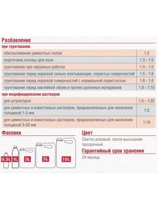 1. Грунтование поверхностей из бетона, газобетона, асбоцемента, штукатурки, шпатлевки, кирпичной кладки, гипсокартона, ДСП и пр. перед последующим шпатлеванием, окраской водно-дисперсионными красками, облицовкой керамической плиткой, нанесением рулонных материалов при внутренних работах в помещениях с нормальной и повышенной влажностью и наружных работах. Применим для подготовки бетонных полов перед нанесением самовыравнивающихся смесей. Пригоден для обработки свежих цементных оснований! (Не подходит для обработки асфальтной поверхности).