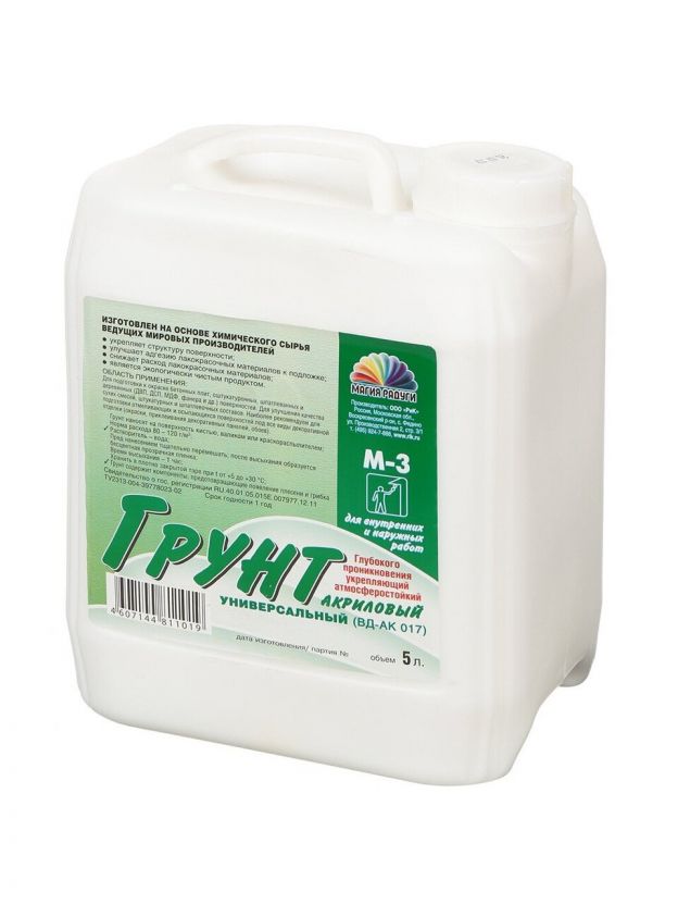 Грунтовка Магия радуги M-3 - атмосферостойкая укрепляющая универсальная грунтовка. Улучшает адгезию лакокрасочных материалов к подложке. Укрепляет структуру поверхности, снижая расход лакокрасочных материалов. Быстро сохнет. После высыхания не выделяет вредных веществ. Содержит компоненты, предотвращающие появление плесени и грибка. Грунтовка не токсична, пожаро- и взрывобезопасна.
