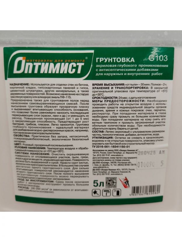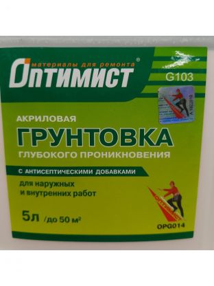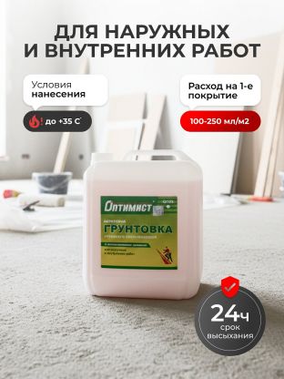 Грунтовка водно-дисперсионная, акриловая, Оптимист, G103, глубокого проникновения, для внутренних и наружных работ, 10 л, зеленая этикетка