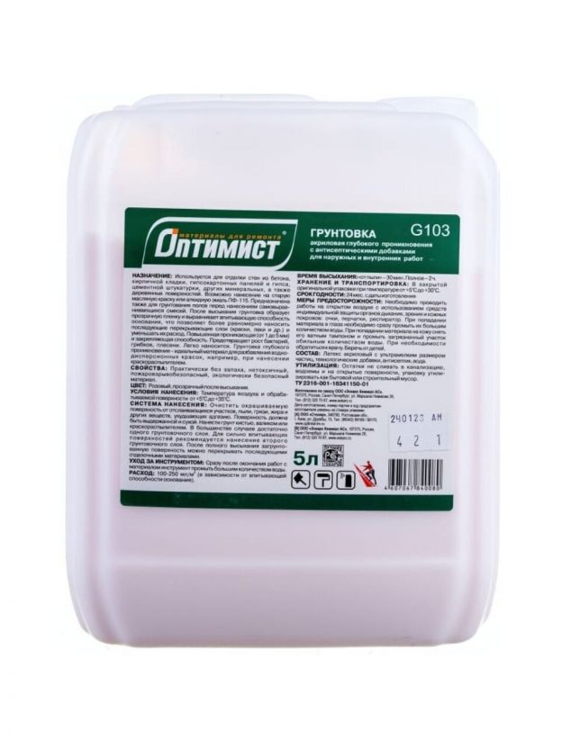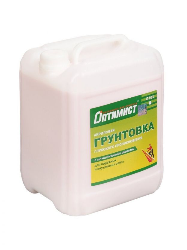 Грунтовка водно-дисперсионная, акриловая, Оптимист, G103, глубокого проникновения, для внутренних и наружных работ, 5 л, зеленая этикетка