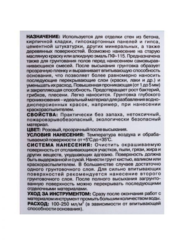 Грунтовка обладает повышенной проникающей и закрепляющей способностью. Предотвращает рост бактерий, грибков, плесени.