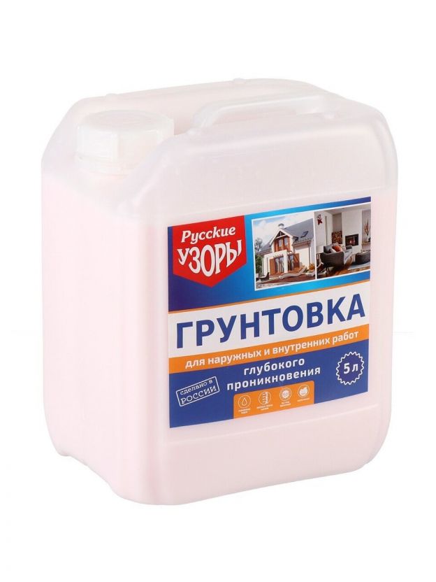 Грунтовка для наружных и внутренних работ на основе акриловых полимеров Русские узоры используется для отделки стен из бетона, кирпичной кладки, гипсокартонных панелей, цементной штукатурки, других минеральных, а также деревянных поверхностей. После высыхания грунтовка образует прозрачную пленку и выравнивает впитывающую способность основания, что позволяет более равномерно наносить последующие перекрывающие слои (краски, лаки и др.) и уменьшать их расход. Грунтовка проникающая - отличный материал для разбавления водно-дисперсионных красок, например, при нанесении их (красок) краскораспылителем.