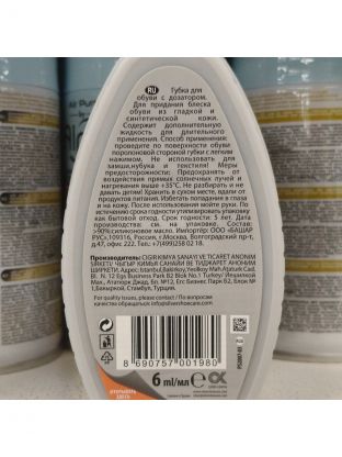 Объем дозатора — 6 мл, этого достаточно для регулярного ухода за одной-двумя парами обуви в течение нескольких недель (зависит от частоты использования).