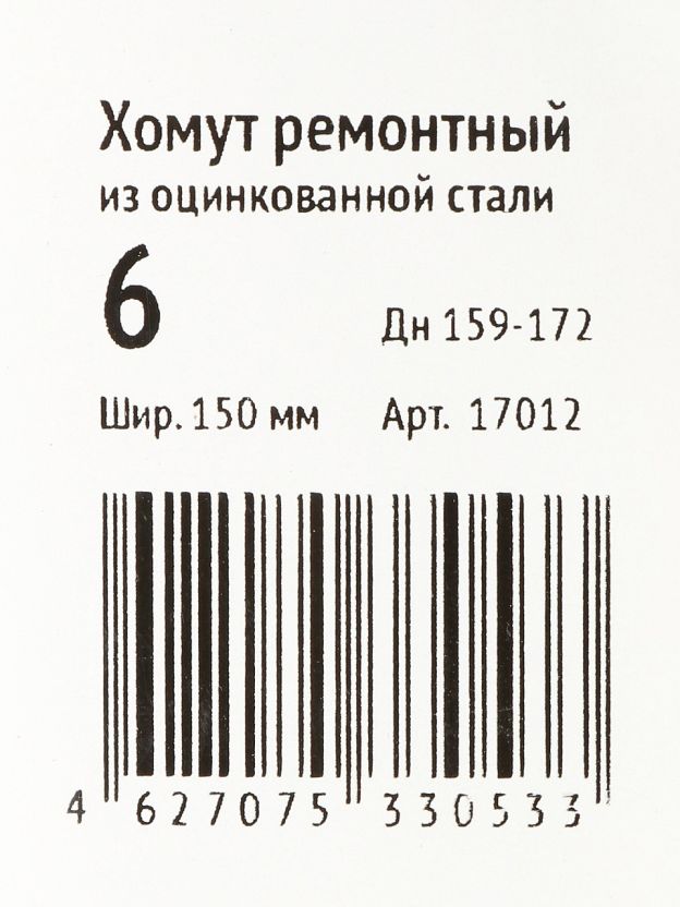 Выбирайте диаметр по размеру трубы: данный хомут рассчитан на 6" (150 мм), ширина — 150 мм, толщина корпуса — 1 мм, крепёжного моста — 2 мм, уплотнителя — 5 мм.
