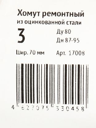 Данный хомут рассчитан на трубы диаметром 3 дюйма (Ду 80), ширина изделия — 70 мм. Толщина корпуса — 1 мм, крепежного моста — 2 мм, уплотнительного слоя — 3 мм.