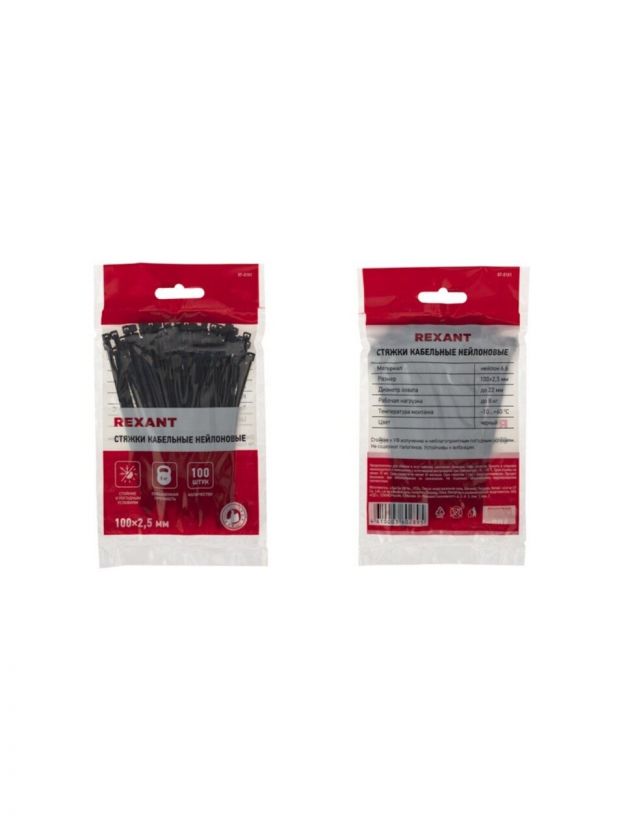 Хомут стяжной кабельный, 2.5х100 мм, нейлон, 100 шт, черный, Rexant, 07-0101