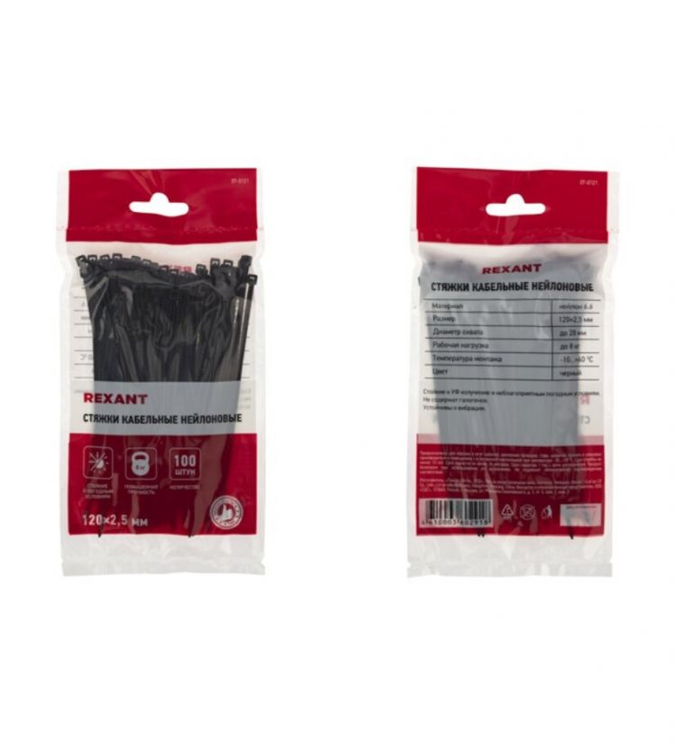 Хомут стяжной кабельный, 2.5х120 мм, нейлон, 100 шт, черный, Rexant, 07-0121