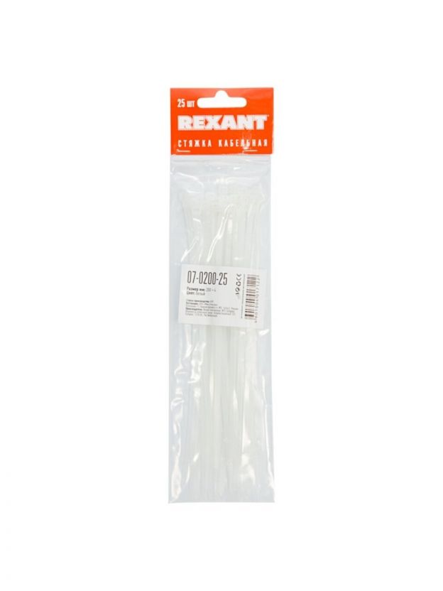 Хомут стяжной кабельный, 3.6х200 мм, нейлон, 25 шт, белый, Rexant, 07-0200-25