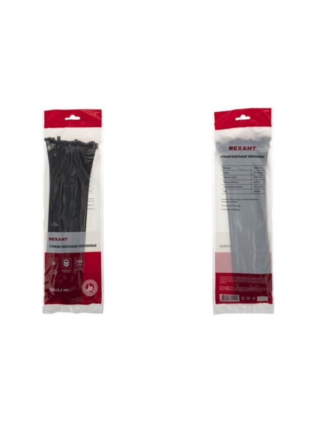 Хомут стяжной кабельный, 3.6х300 мм, нейлон, 100 шт, черный, Rexant, 07-0301