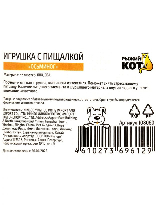 Закажите игрушку для собак Рыжий кот с пищалкой прямо сейчас — получите быстрый отклик питомца, выгодные условия доставки и уверенность в качестве товара.