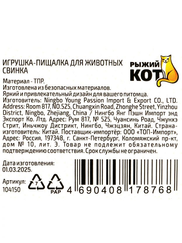 Выбирайте игрушку-пищалку Рыжий кот «Свинка» недорого — оформите заказ онлайн и получите быструю доставку. Гарантия оригинальности и проверенное качество для вашего любимца.