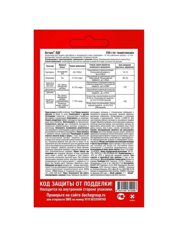 Состав: ВДГ (250 г/кг тиаметоксам).
