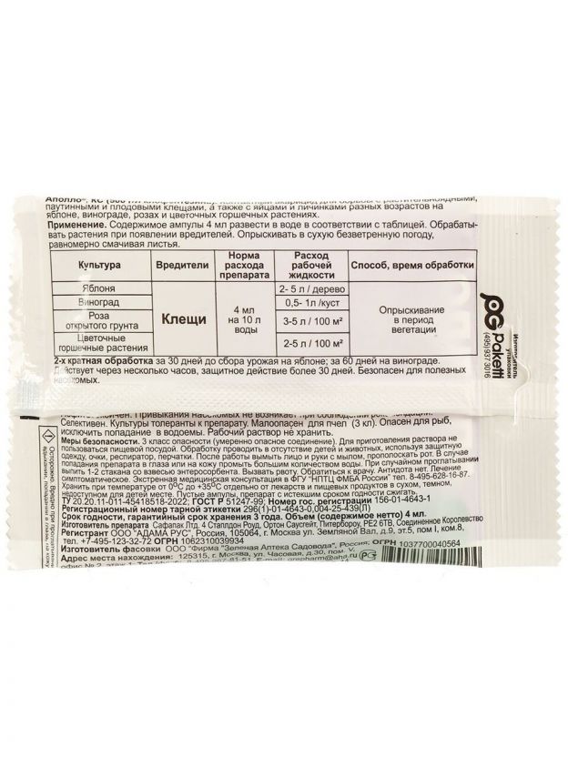 Инсектицид Аполло, от клещей, ампула, 4 мл, Зеленая аптека Садовода