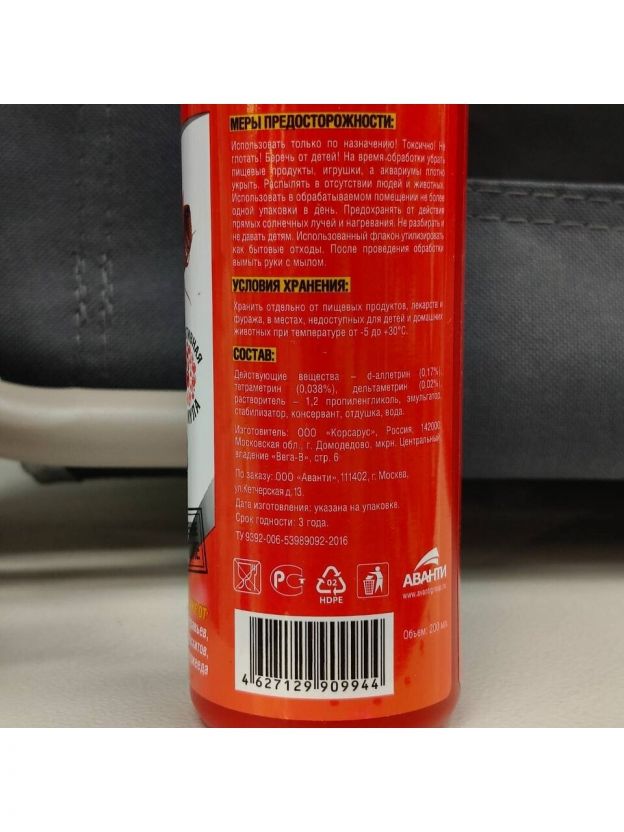 Для уничтожения нелетающих насекомых: средство распылять с расстояния 20 см.
